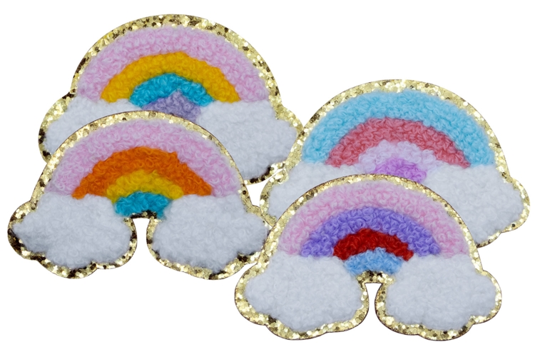 Aufnäher / Patch Set, Chenille, 4 Regenbögen, Goldglitzer-Untergrund, Klebefläche, 70x45 mm