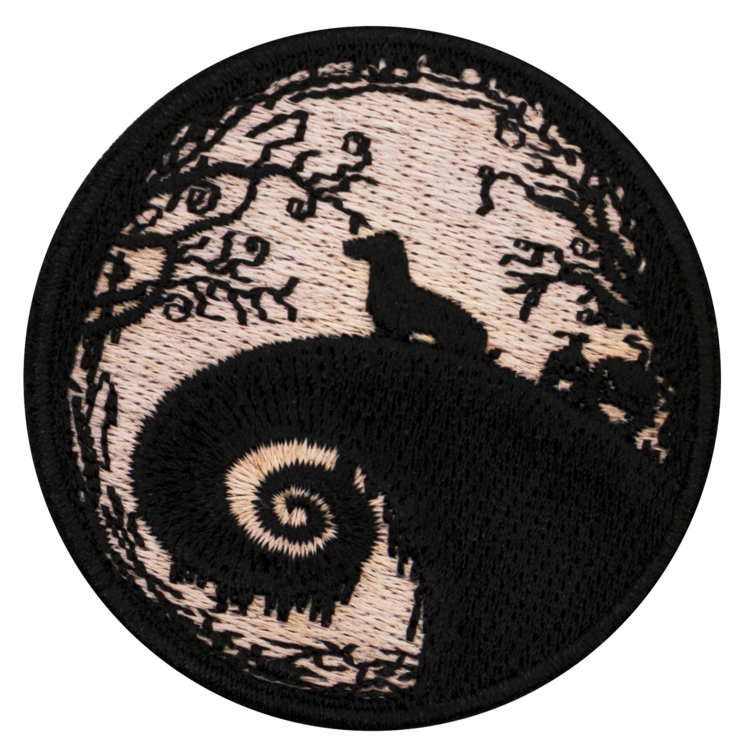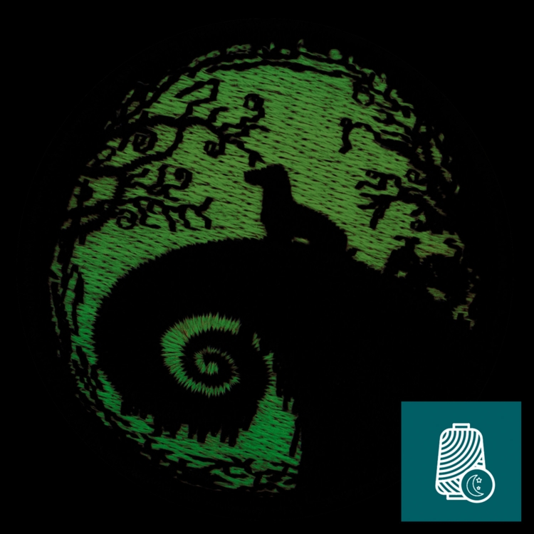 Der runde Glow-in-the-Dark Patch zeigt einen Hund auf mystischem Hügel - perfekt für Outdoor-Fans und Nachtspaziergänge.