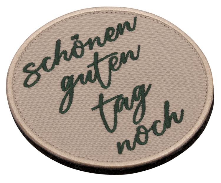 Der runde Patch mit grüner Schrift verbreitet Höflichkeit mit Augenzwinkern und lässt Taschen, Rucksäcke oder Jacken freundlich wirken.